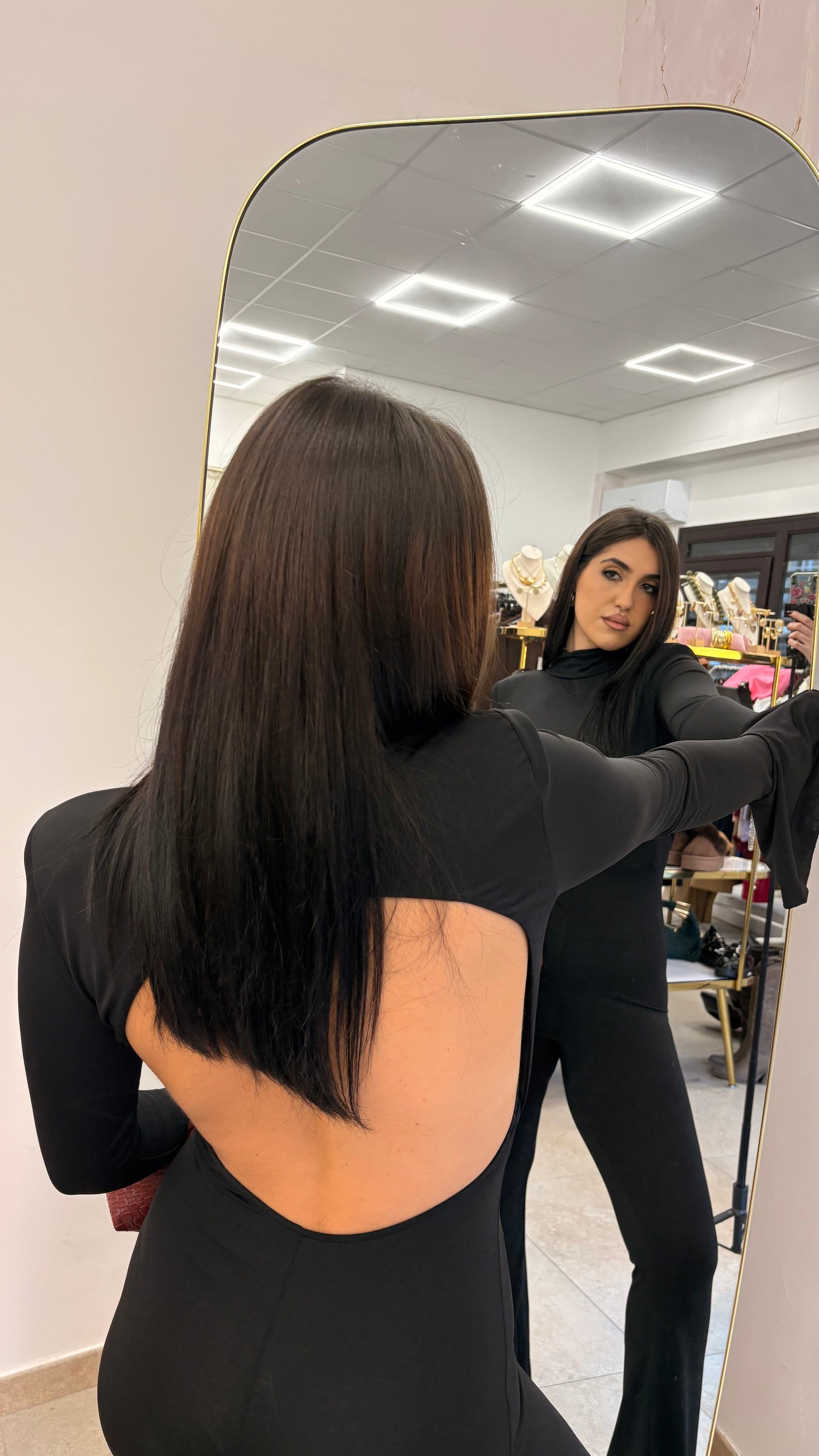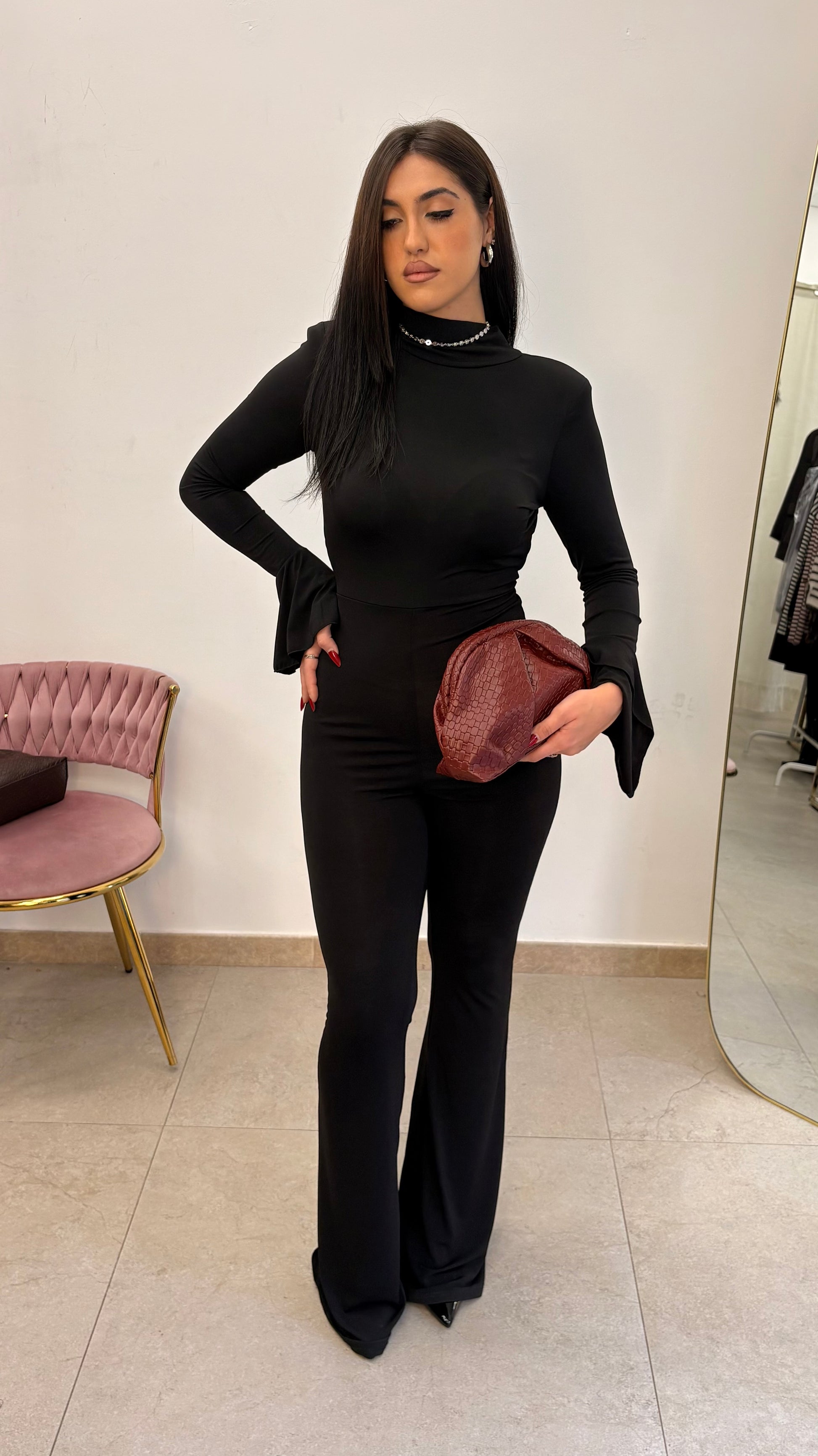 - Dettagli: Scollatura posteriore, Spalle leggermente strutturate, Manica ampia, Pantalone a zampa